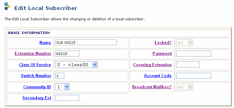The table for Field Definitions; Edit Local Subscriber page describes only the Account Code field. For additional information about the Subscriber screen and the fields it contains, see Adding a Subscriber.